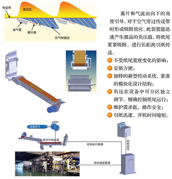 該裝備是因為氣翼手藝使傳遞帶外表發生負壓,將運轉中的紙尾牢牢吸附在傳遞帶上。手藝道理是傳遞帶下方的翼片吹送緊縮氛圍所發生的氣翼效應。這類氣翼效應可保障該引紙裝備以少的氛圍和能耗量發生極高的負壓值。